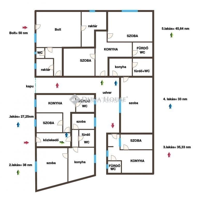 Befektetők, vállalkozók figyelem!Kecskemét központ közeli részén, a Bem utcában eladó egy üzlethelyiség+ 5 lakás egyben!Ingatlan adatai ami egy helyrajzi számon szerepel jelenleg: - üzlethelyiség: 50 nm- 1.lakás: 27,25 nm- 2.lakás: 38 nm- 3 lakás: 45,64 nm- 4 lakás: 33 nm- 5 lakás: 35,33 nmFűtés: gázkonvektor, és klíma minden lakás külön villany és gáz almérőkkel van ellátva.Jelenleg az összeg helyiség ki van adva bérlőknek, akik szeretnének is maradni, ha az új tulajdonos elképzelésének megfelelően, továbbra is bérleményeket szeretne működtetni új ingatlanában. Jelenleg közel 1 millió Ft a havi biztos bevétel. Számoljon és tekintse meg velem az ingatlant, előre egyeztetett időpontban. Kérem keressenek bátran. A teljes Duna House ingatlan kínálatával állok rendelkezésére. Keressen bizalommal. | |||