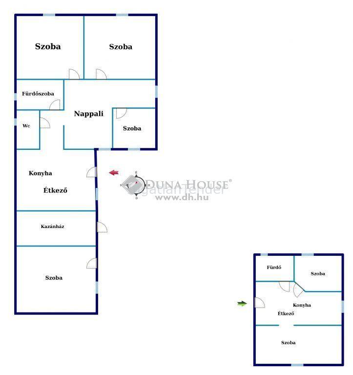 Befektetők! Nagycsaládosok Figyelem!Kecskemét, Szeleifaluban 2 külön bejáratú ingatlan, 2 utcáról megközelíthető telken eladó.A ház főbb felújításokon átesett, apróbb javítással, festéssel költözhetőek az ingatlanok.A 110 m2-es főépület betonalapon, egyik része vályogból, az utólag hozzáépített rész téglából épült.A 2010-ben felújított nappali + 3 szobából álló épületben a meleget gázfűtés mellett vegyes tüzelésű kazán és kandalló biztosítja.Az ablakok, villanyvezetékek, vízvezetékek cserélve lettek.A különálló kisebb 50 m2-es házban nappali + 1 szoba, konyha, fürdőszoba kapott helyet.Sok lehetőséget rejt magában, nézzük meg, ne maradjon le róla! A teljes Duna House ingatlan kínálatával állok rendelkezésére. Keressen bizalommal. | |||