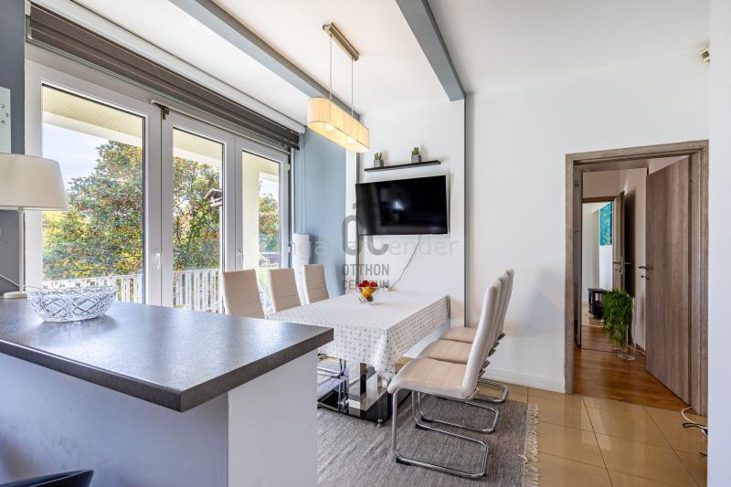 Szegeden, a Móra utcában 127,8 nm / 140 nm-es, 4 szobás, 2 fürdőszobás, nagy erkélyes exkluzív lakás, garázzsal (13nm), 10 nm-es saját tárolóval az udvarban, a ház előtt saját parkolási lehetőséggel. A ház 2 lakásos, a Moszkvai körúthoz közel eső részen van, saját zöld udvara várja pihenni vágyó lakóit. A lakás belső két szinten helyezkedik el, csodás nyitott térben, ragyogó fényekkel. Az ingatlan exkluzív belső kialakítása teszi egyedivé a lakást, amelybe csak költözni kell. A teljes elektromos hálózat felújítása megtörtént. Az alsó szinten egy csodás nappali, fürdőszoba, WC, konyha-étkezővel, kamrával, mellett egy vendég szoba és egy 8 nm-es erkély található. A felső szinten egy nagy méretű tükrös tolóajtós gardrób rejti el a ruhaneműt. Ezen a szinten van 2 hálószoba, egy fürdőszoba amelyben tusolóabin és WC található. A nappaliban kandalló és a bár-sarok mellett a nyitott légtérben csodálatos boltíves térelválasztási megoldással találkozhatunk. A lakás fűtése gáz-cirko, padló és radiátoros hőleadókkal megoldott. Az összes külső nyílászáró korszerű hő-és hangszigetelt műanyag. A belső nyílászárók jó minőségűek. A konyhában egyedi tervezésű bútort találunk korszerű beépített gépekkel. Meglepő lehet de kamra is rendelkezésre áll, kiváló pakolási lehetőséget biztosítva. Az étkezőből és a mellette lévő szobából is nyílik kijárat a nagyméretű erkélyre, ahonnan a belső zöld kertre nyílik kilátás. Ennek a zöld udvarnak a végében még egy 15 nm-es tároló kiváló lehetőség a kerti bútorok és pl. grillező tárolására. A lakásban összhangban van a burkolatok és a teljes berendezés színvilága, stílusa, ezért igazán elegáns, kellemes otthon. Extrák: erkély | |||